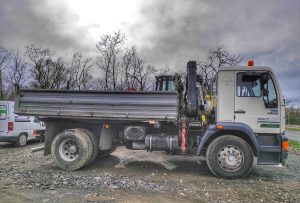 7,5 tonnás darus billencs teherautó, ömlesztett áruk és raklapos áruk szállításához 3 tonnáig