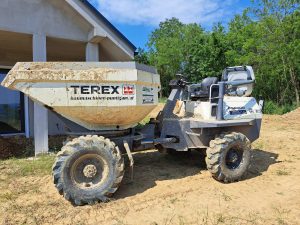 Terex 6 tonnás forgózsámolyos dömper összkerékhajtással, nehezen megközelíthető helyekre, hatékony munkavégzés, ömlesztett áru szállítása, mixer beton behordás, akár alapba öntve